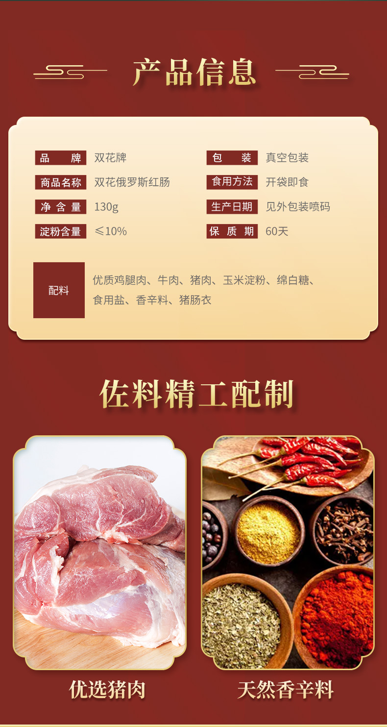 天猫双花牌食品旗舰店29.8元,可领13元优惠券,实付16.8元到手。规格为130g*4根,双花俄罗斯风味红肠,淀粉含量≤10%,浓浓肉香,口感Q弹,肉感十足,经典的佐料调制,满满的俄罗斯风味。