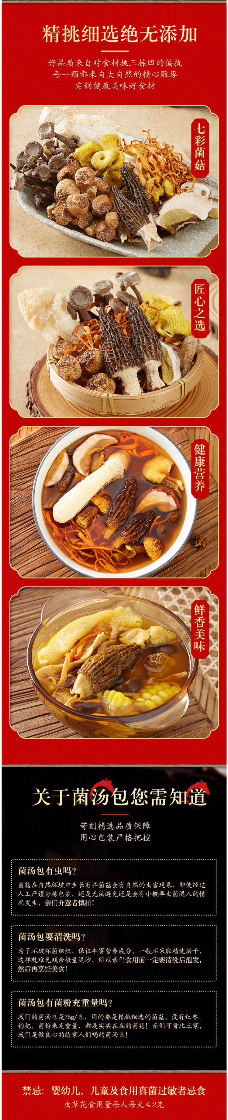 这款菌益七彩菌汤包是一款食用菌菇汤包,精选热销菌菇搭配组合,分别是织金竹荪、鹿茸菇、鸡油菌、虫草花、姬松茸、牛肝菌、羊肚菌,菌味浓郁、汤底清香,入口香醇,营养更丰富。