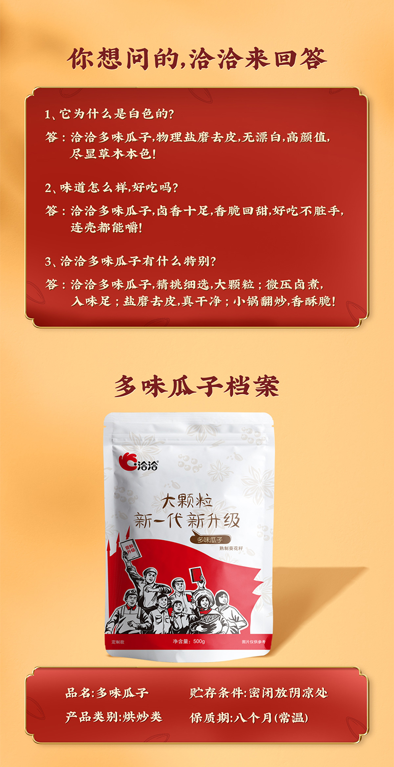 洽洽多味瓜子,大颗粒升级、粒仁香皮薄好嗑,咔嚓一味迸发,香味在舌尖旋转跳跃余味悠长,黄金产地直采,科学种植日照充足颗粒饱满,够批剔当然够出挑,6+1道品质甄选,粒粒精挑,恰到好处的香脆美味,改炒为煮入味均匀。领券链接点此