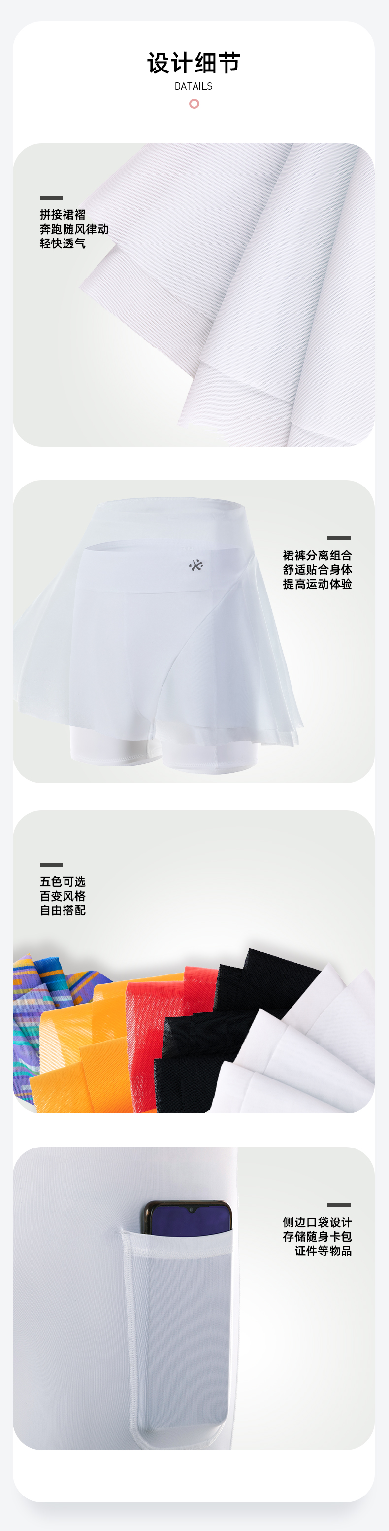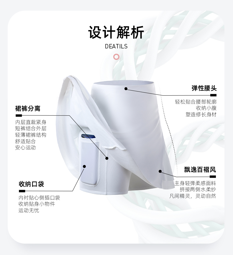 裙裤分离设计,内层内层直裁紧身贴合,短裤结合外层轻薄裙裤,好看还不担心走光。弹力内衬可拆卸单穿,化身运动短裤。内衬还有侧插口袋,收纳贴身小物件;弹性腰头,能贴合收纳小腹,除了运动平常也能穿。