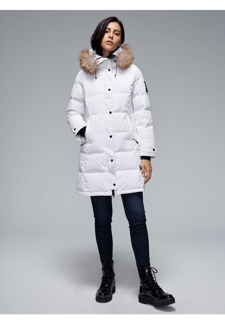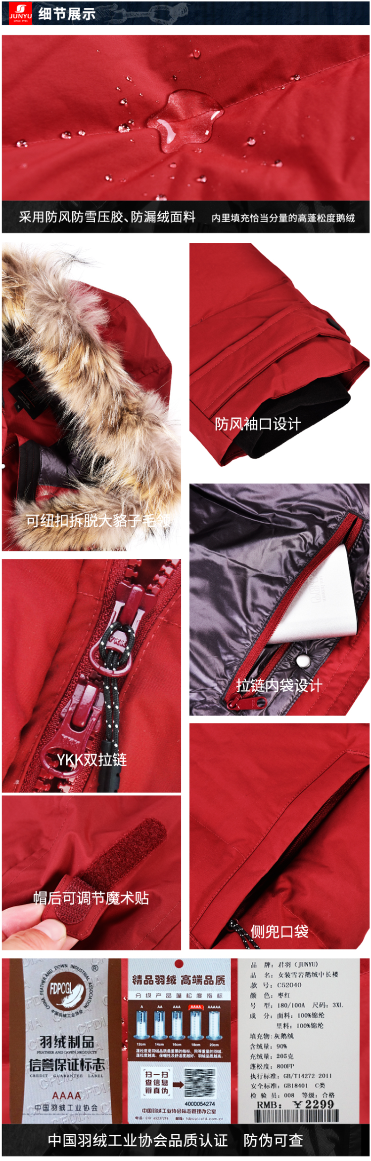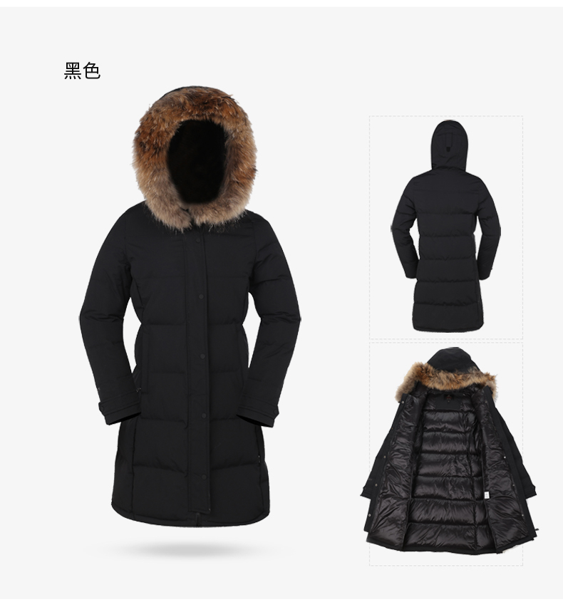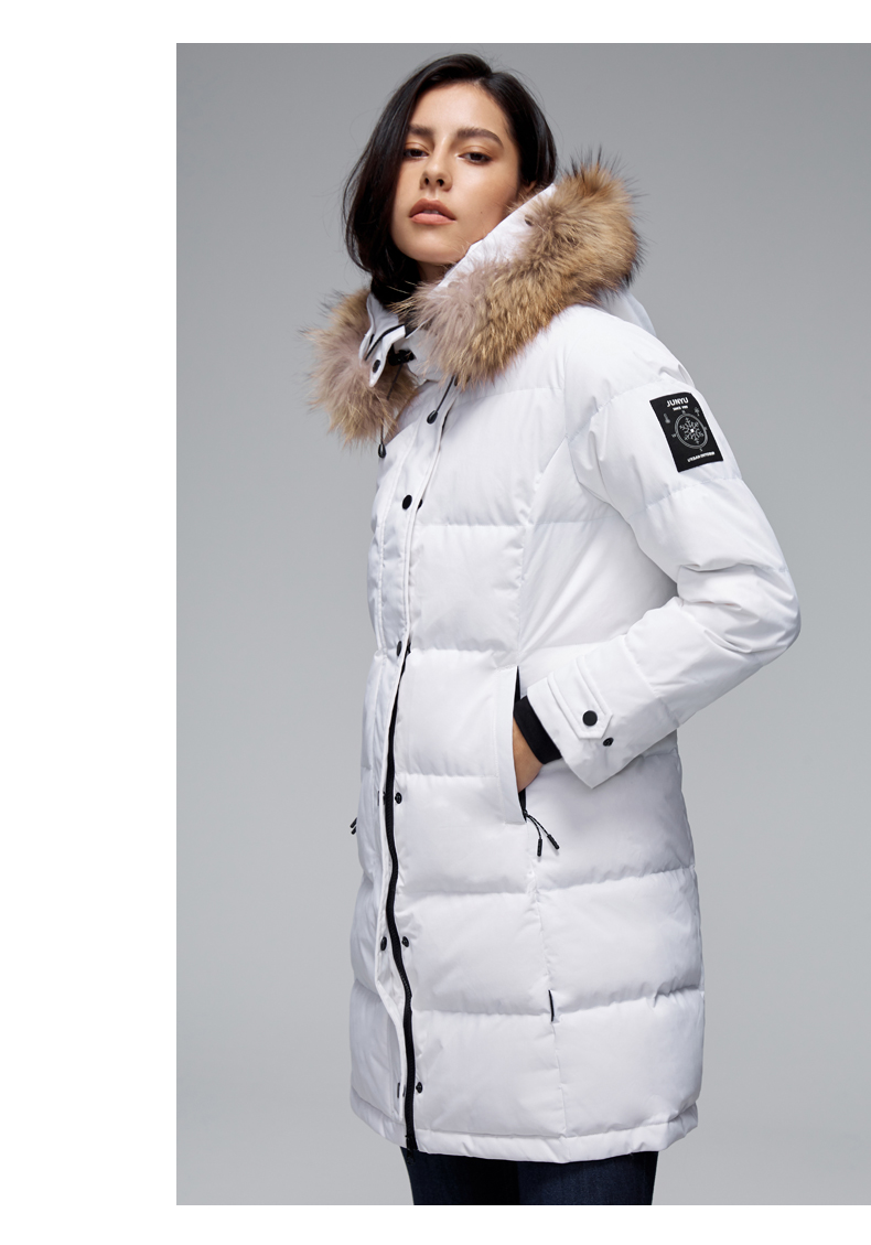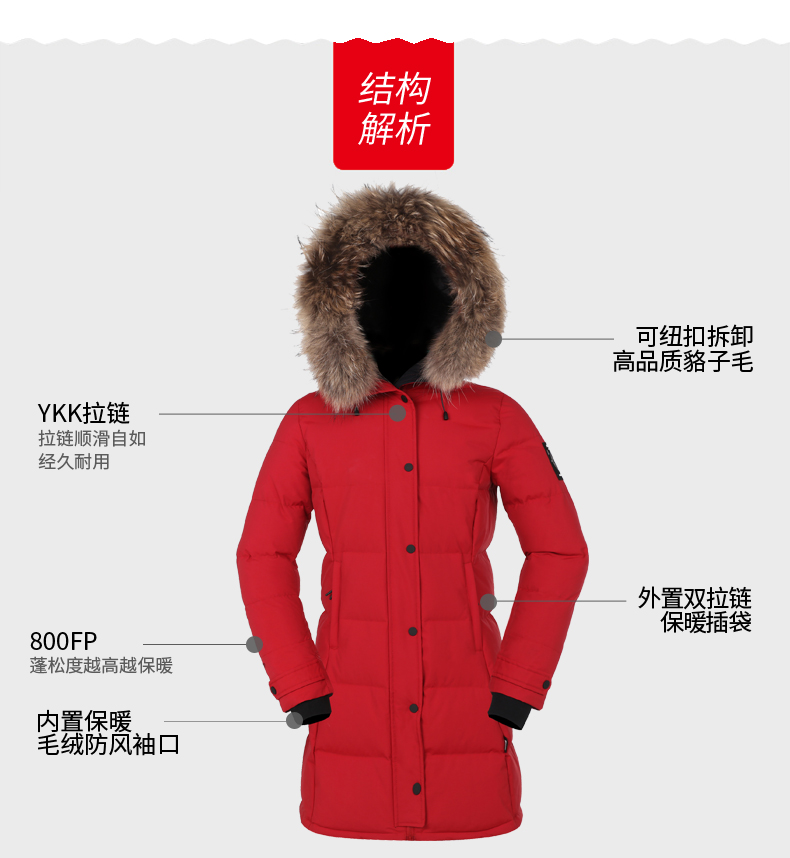 这款君羽雪岩女中长款羽绒服,属于严寒系列,可抗0℃~-15℃,是2018年的冬季款,内里填充了800蓬90%鹅绒,M码充绒177克,属于中厚款羽绒服,外层是高密度耐磨锦纶布,伴有压胶加持,可防风防雨雪。直筒微收腰版型,长度过臀及大腿。
