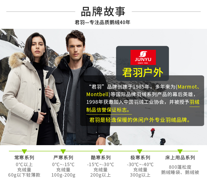 君羽创立于1985年,一直为Marmot/土拨鼠、日本Mont-bell等户外大牌代工羽绒服。“君羽”与“极星户外”都是旗下自有品牌,其中“君羽”定位时装,“极星”定位户外服装。极星拥有8000米以上高海拔,和极地羽绒服、羽绒睡袋产品线,曾是中国南极科考队、中国珠峰重测高度队的装备。
