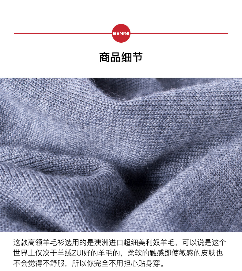 这款本米男高领羊毛衫,采用100%澳大利亚进口超细美利奴羊毛(世界上最好的羊毛,没有之一),和一般羊毛相比,美利奴羊毛纤维密度高,织出来的面料回弹性好,不易起球,更保暖更轻更软,还没有羊毛的扎人感,可直接贴肉穿,能抗菌透气。