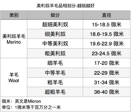 美利奴羊毛的品质,核心是看羊毛的粗细,越细品质越高,单位是微米/英文"Micron"。一般羊毛直径在22-29微米之间,而美利奴羊毛一般在18.5-24微米,美利奴羊羔毛最细可低于17微米,接近羊绒了。不超18.5微米属于超细美利奴羊毛,可做内衣贴身穿,速干抑菌不扎人,是运动户外高端功能内衣的首选。