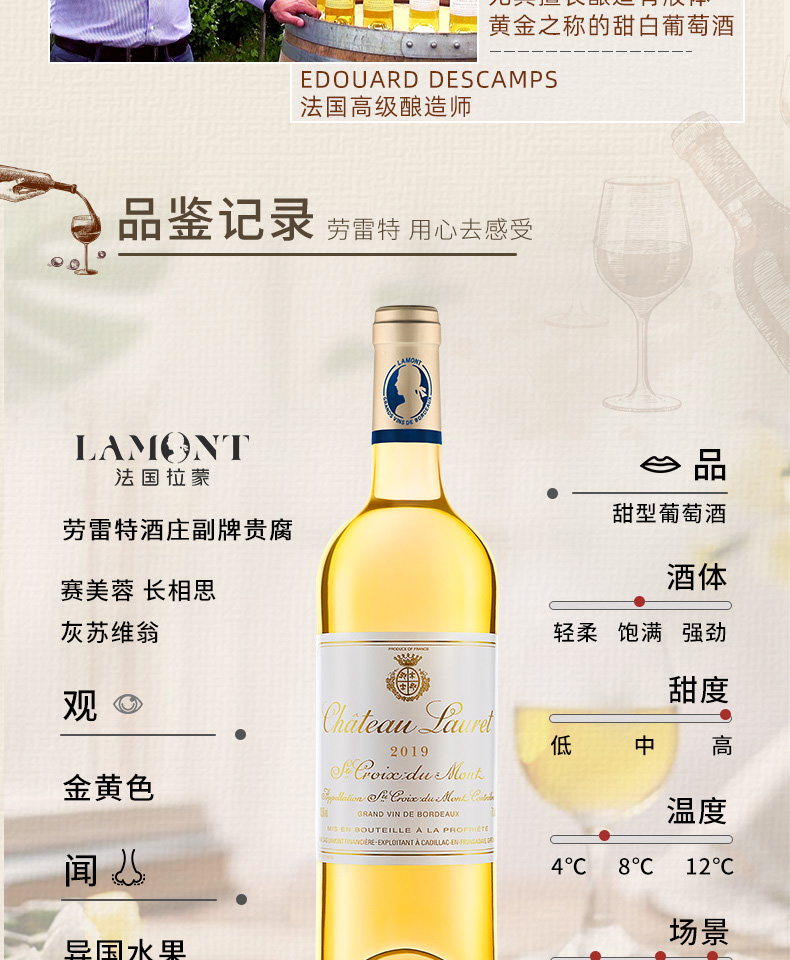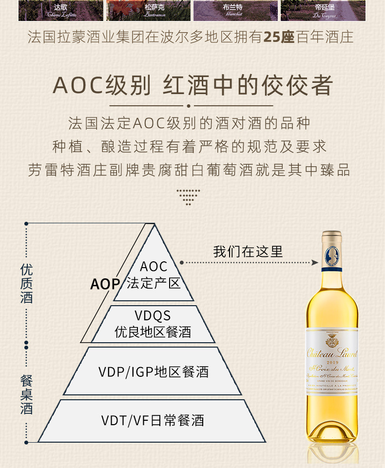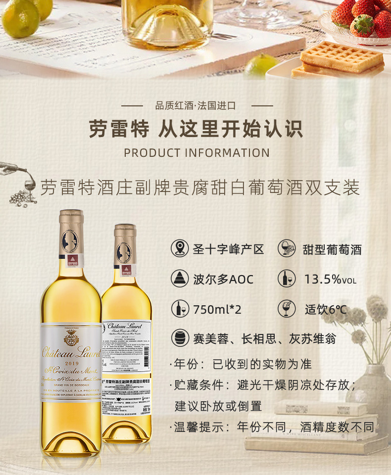 贵腐酒以波尔多的苏玳产区为贵腐之最,查了下波尔多的劳雷特酒庄Chateau Larette位于波尔多第二大贵腐甜酒产区,圣十字峰产区的山丘的南坡,紧邻知名产区苏玳。素有“小苏玳”之称。