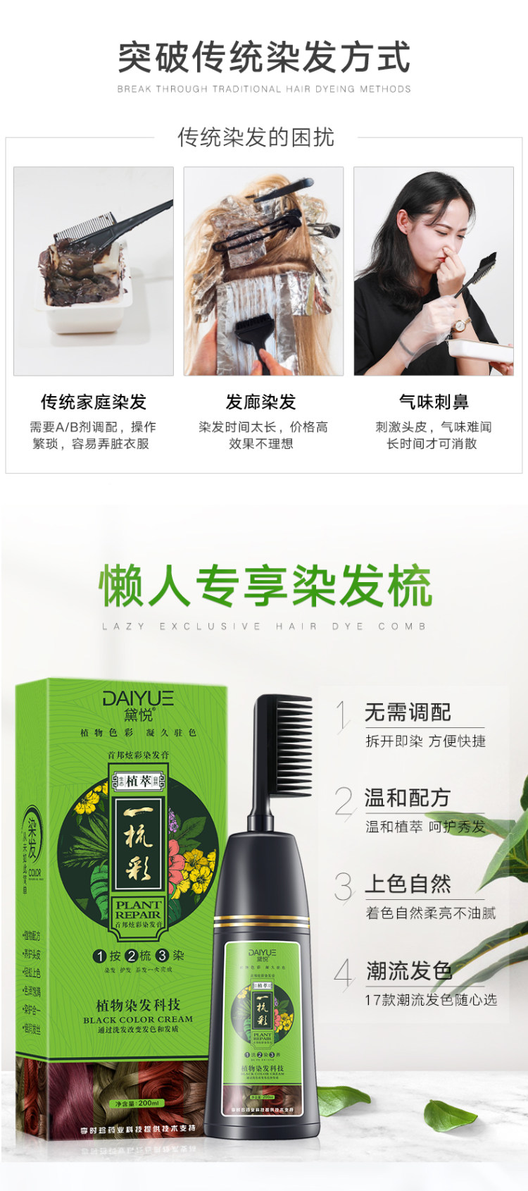 黛悦旗舰店,专门做高端染发剂,炫彩发型,植物精华,无需调配,染完不伤发,一按一梳一洗,15分钟快速上色,轻松搞定染发,健康安全,16种颜色可选,赠运费险。