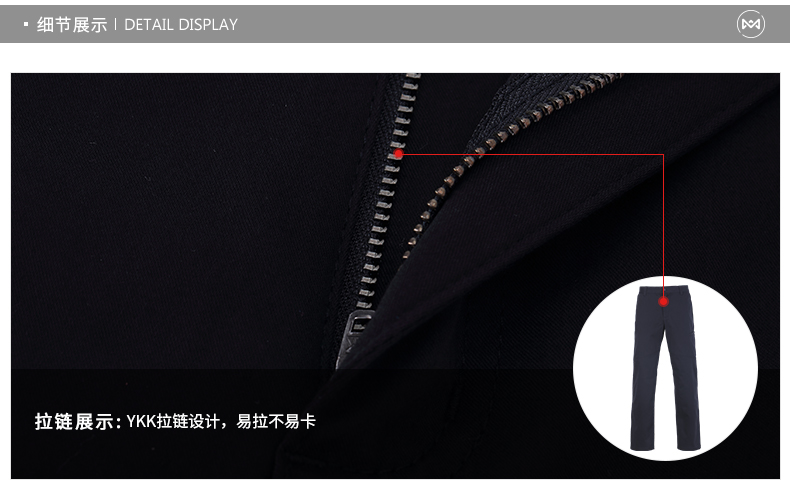 在款式和细节上,标准版型,3D立体剪裁,符合人体工程学设计,上身活动自如,灵活无束缚。前门襟使用日本YKK拉链,屁股后口袋设有拉链,置物安全。