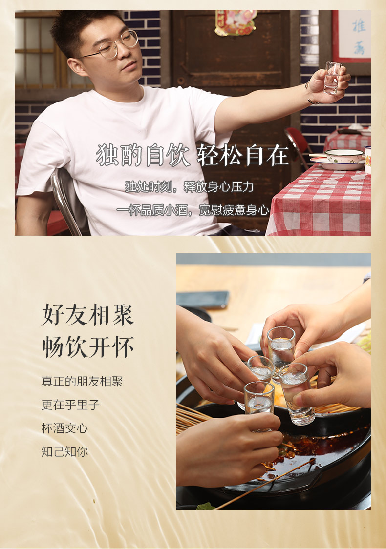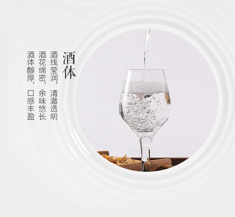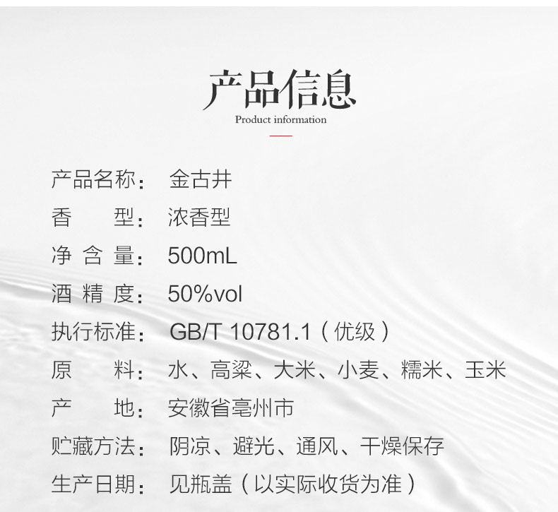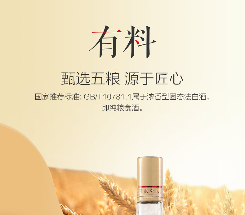 这款光瓶 纯粮白酒属于浓香型固态法白酒,以高粱、大米、小麦、糯米、玉米为原料。执行标准采用GB/T 10781.1属于国家标准优级,酒精度:50%vol,酒体醇厚口感丰盈;酒花绵密,余味悠长;酒线莹润,清澈透明。玻璃瓶体加复古烫金瓶盖,精简低调更立体,更古拙,送人自用都不错。