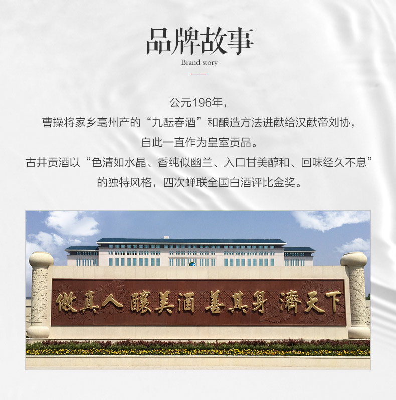 古井贡酒是亳州传统名酒。产自安徽省亳州市,属于亳州地区特产的大曲浓香型白酒,有“酒中牡丹”之称、被称为中国八大名酒之一,在全国第2届评酒会上获得第2名,这届评酒会是全场盲评,也是茅台酒唯一一次跌下神坛,获得了第5名。