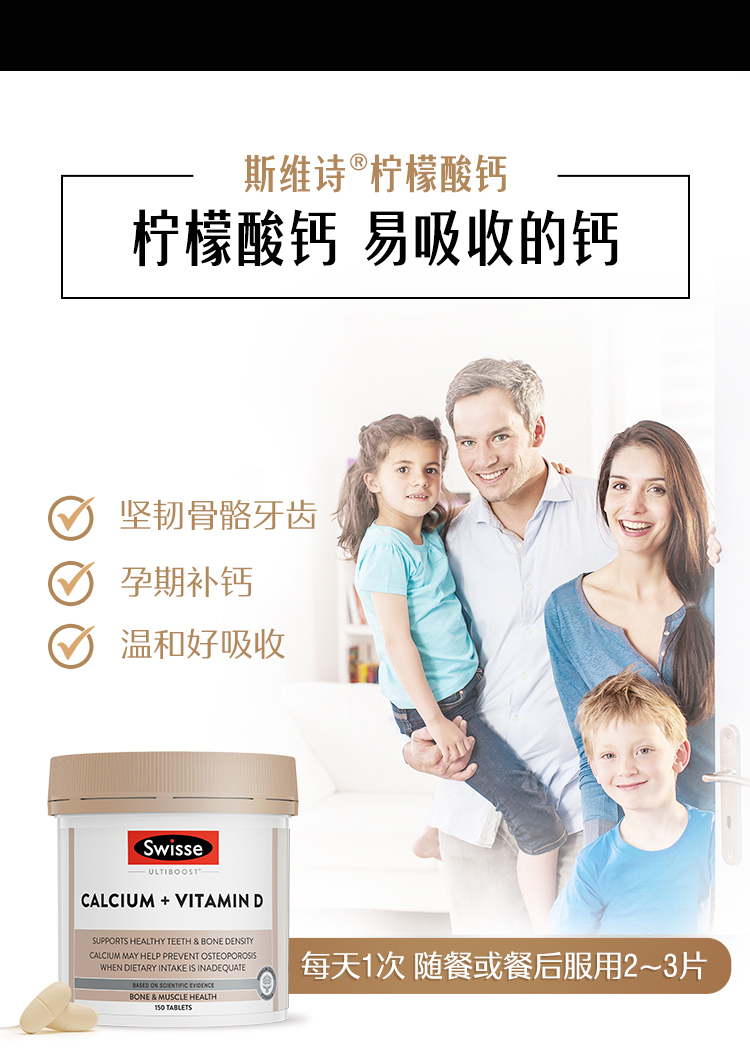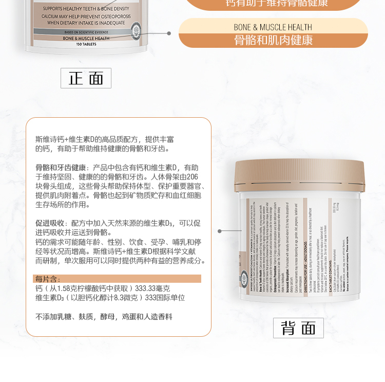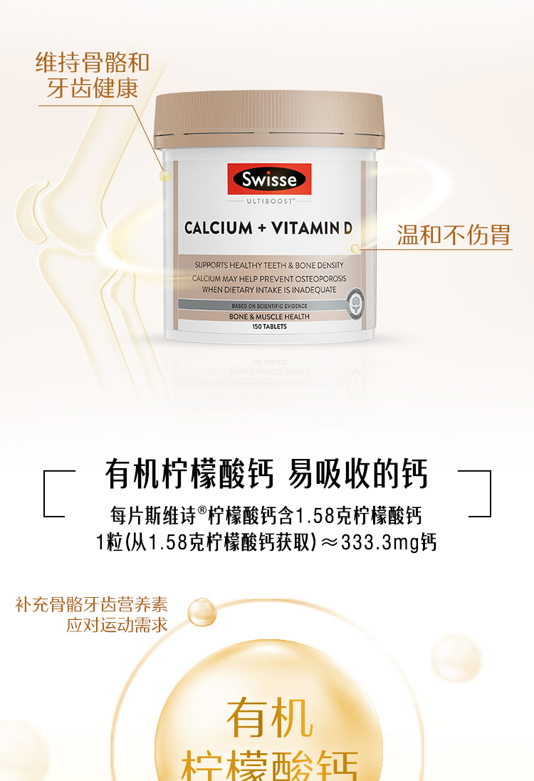 这款钙片含有天然钙和维他命D3,维他命D3协助钙质吸收。能够防治骨质疏松、骨折、腰酸背痛、抽筋、驼背、高血压、失眠、痛经、情绪不稳定等症状,调节心脏节律,有助于维持正常血液凝固,预防儿童佝偻病,成年人软骨症和骨质疏松,对中老年人的身体具有明显改善作用。规格150粒