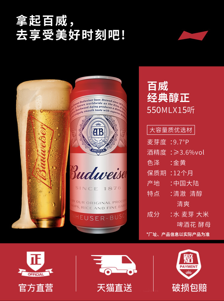 百威(Budweiser)是世界知名的啤酒品牌,1876年诞生于美国,创始人是Adolphus Busch,公司总部设在美国密西里州圣路易斯市。百威啤酒,百年发展中一直以其纯正的口感,过硬的质量赢得了全世界消费者的青睐,长久以来被誉为是“啤酒之王”。