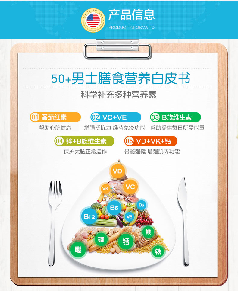 男性款特别添加叶黄素和番茄红素;科学补充多种营养。其中B族可维护心血健康,“叶黄素”具有保护视力,缓解视疲劳,预防老年性黄斑区病变、白内障等疾病的眼盼保健及其它抗衰老的功效。