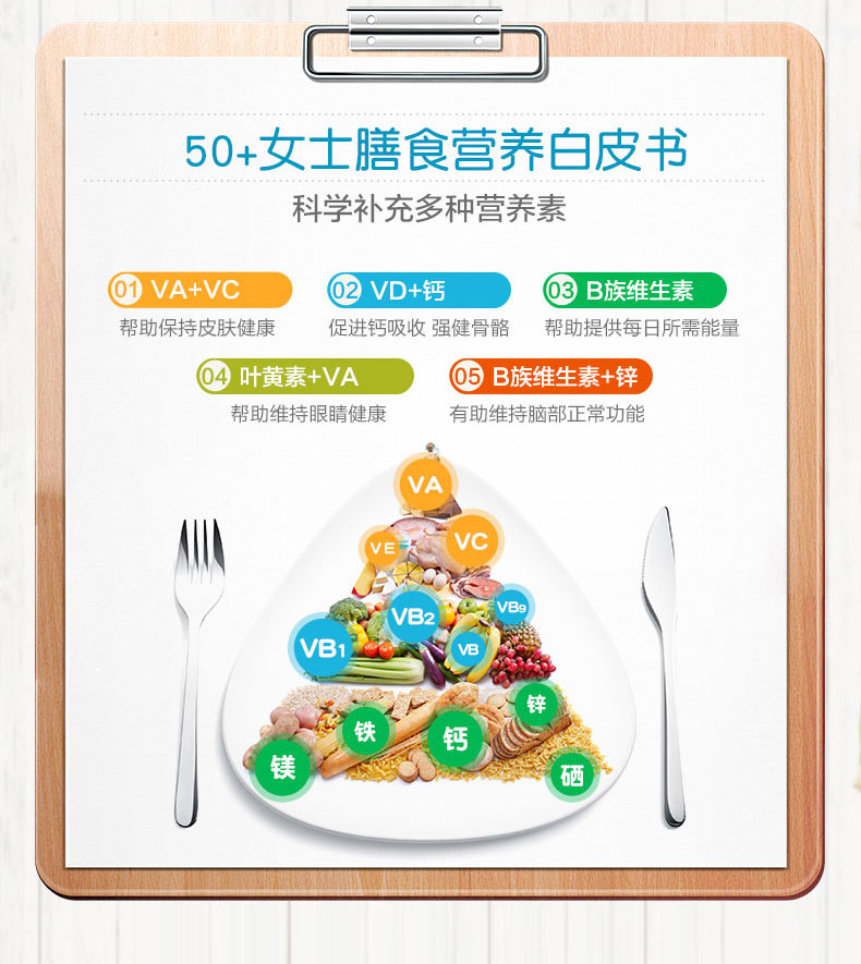 女性款特别添加的“叶黄素”具有保护视力,缓解视疲劳,预防老年性黄斑区病变、白内障等疾病的眼盼保健及其它抗衰老的功效。含钙,可以强健骨骼,防止骨质疏松。