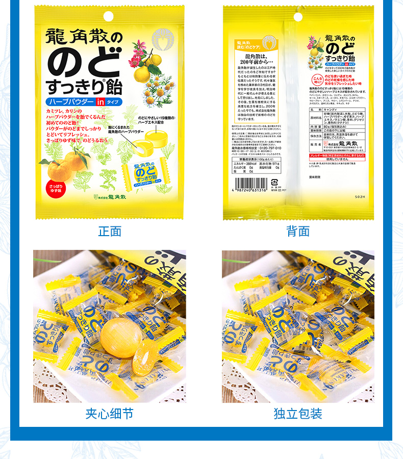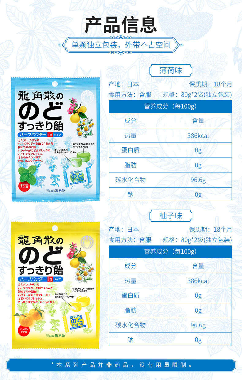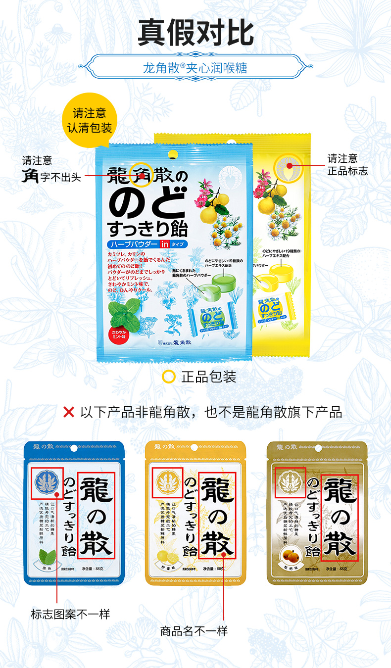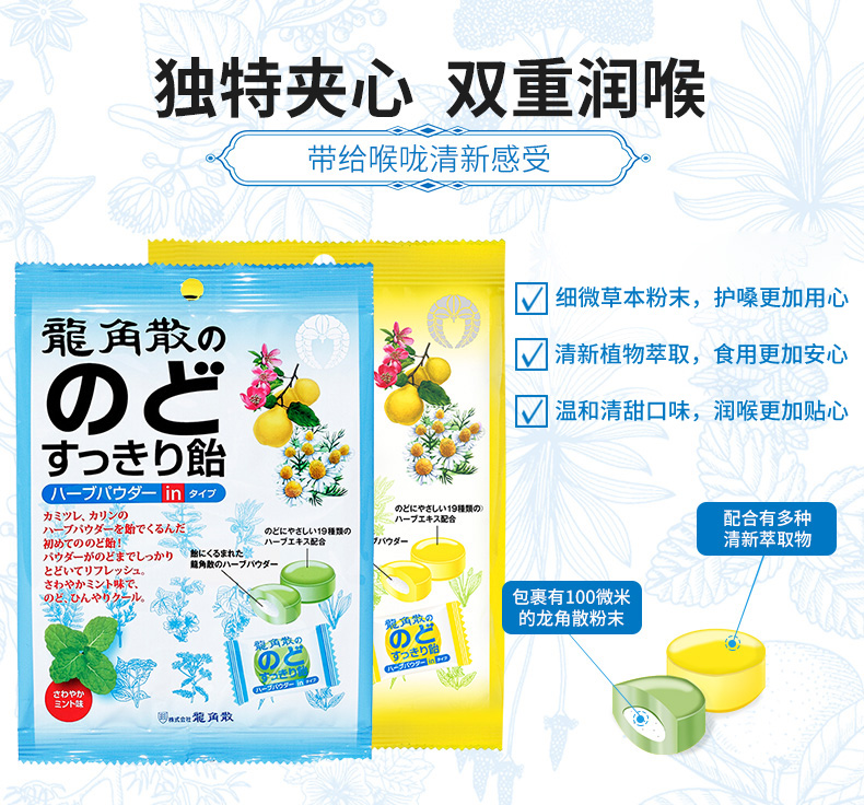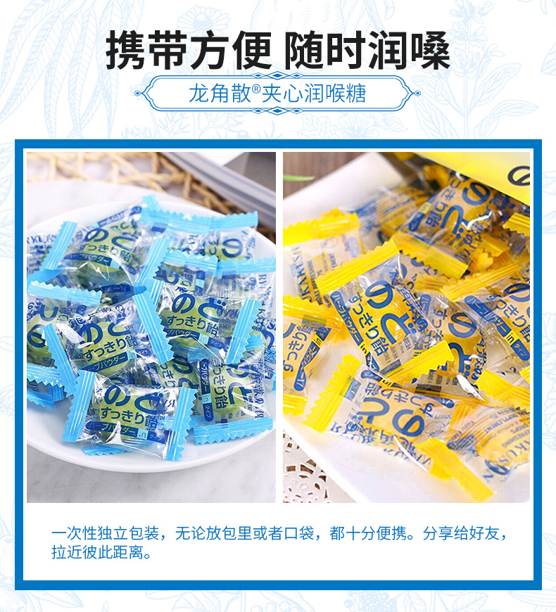 这款龙角散 夹心润喉糖,日本原装进口,是粉末和夹心的双重润嗓,直接作用于咽喉粘膜,性质温和,食用安全。添加的龙角散草本微粉均匀散布在润喉糖中,配合有益于咽喉的清新草本萃取物,持久护嗓。
