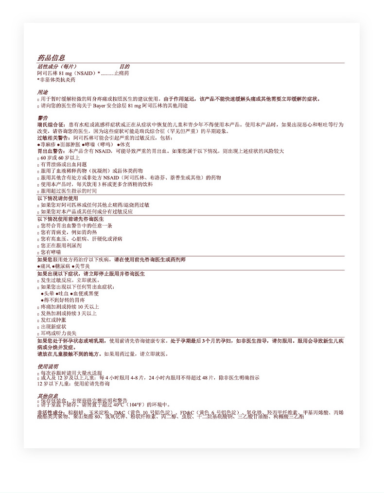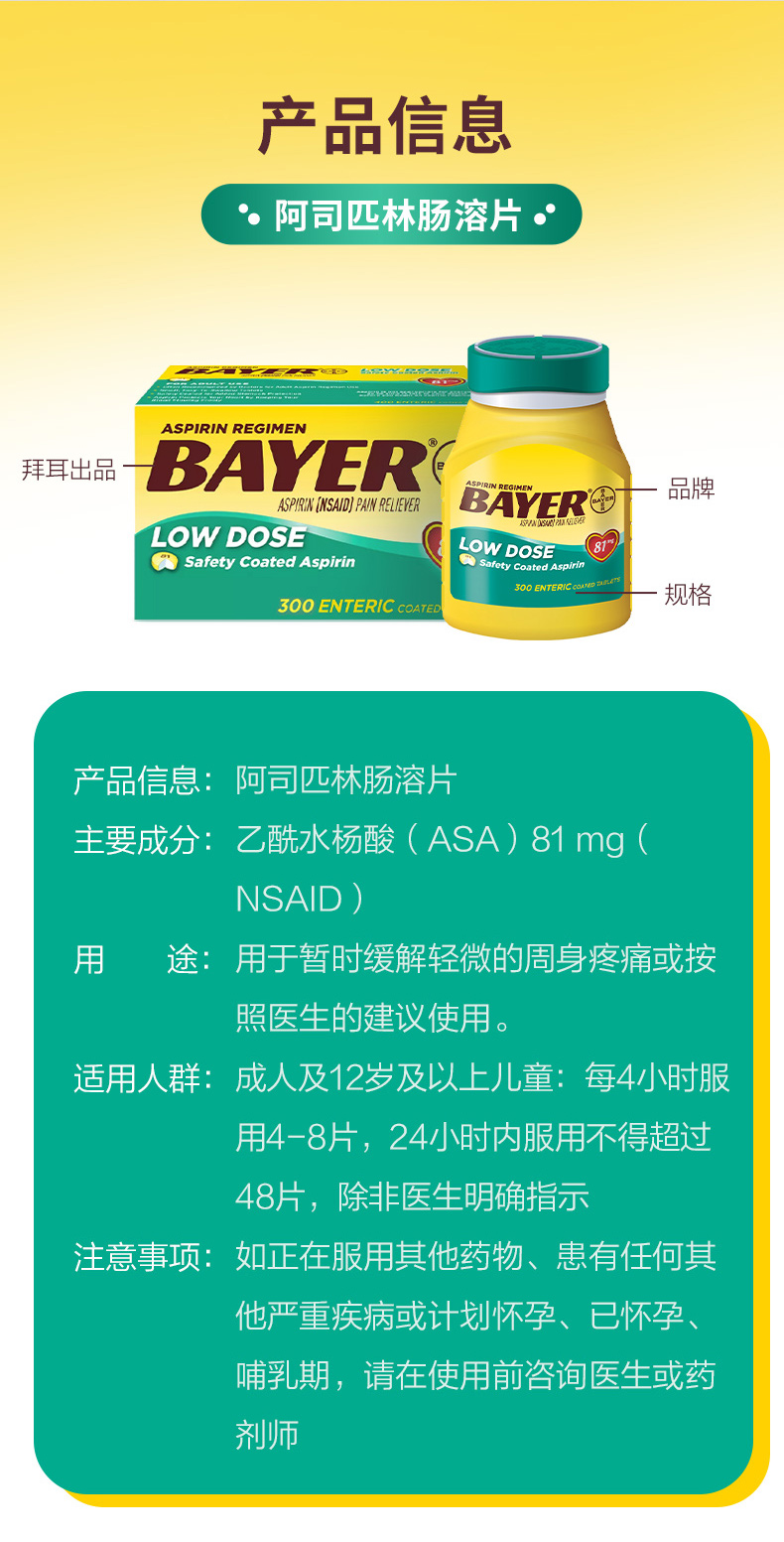 这款是拜尔的阿司匹林,81mg小剂量,美国原研药,有慢性病并且关注药物的朋友都知道,原研药要强过仿制药,虽然现在我们国家推出了药物一致性认定,仿制药有了制度的检验,但我还是推荐有条件的话,最好吃原研药。