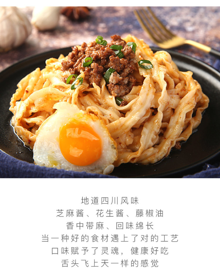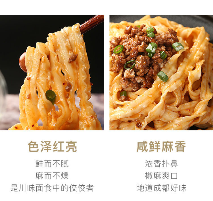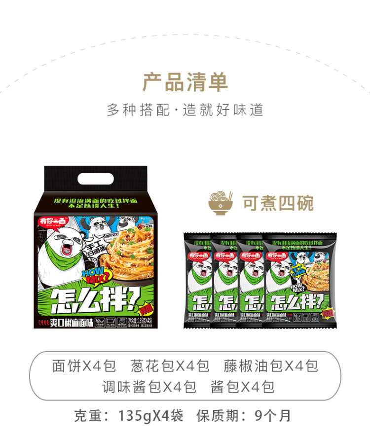 精致速食面,葱花包、藤椒油包、芝麻酱花生酱、酱包,一共四种调料,再加上自然发酵、八小时日晒的手工折叠煮面,拒绝油炸方便面。135g分量又足领券链接点此