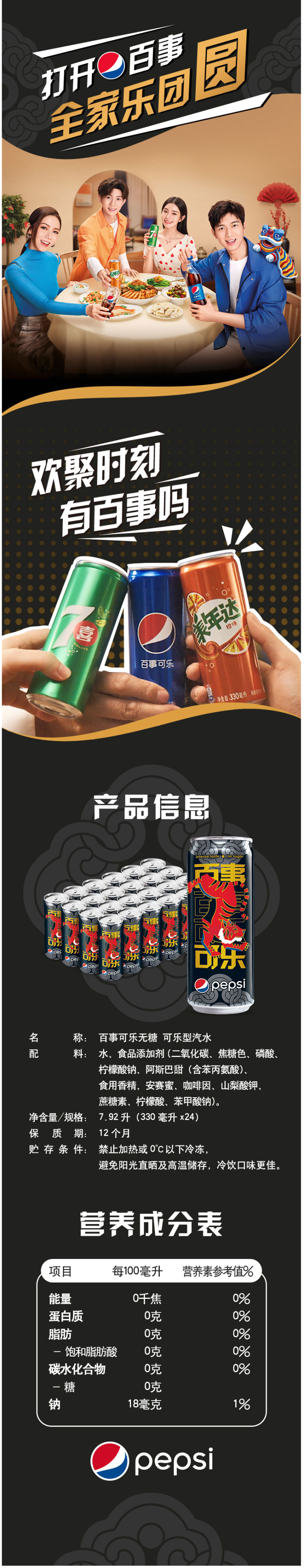 百事(PEPSI)该款无糖可乐型碳酸汽水,主打无糖、低热量,这里的无糖指的是不含蔗糖成份,虽然不含糖,但为了保持饮料的口感,用了阿斯巴甜、安赛蜜和蔗糖素这些甜味剂来代替白糖。