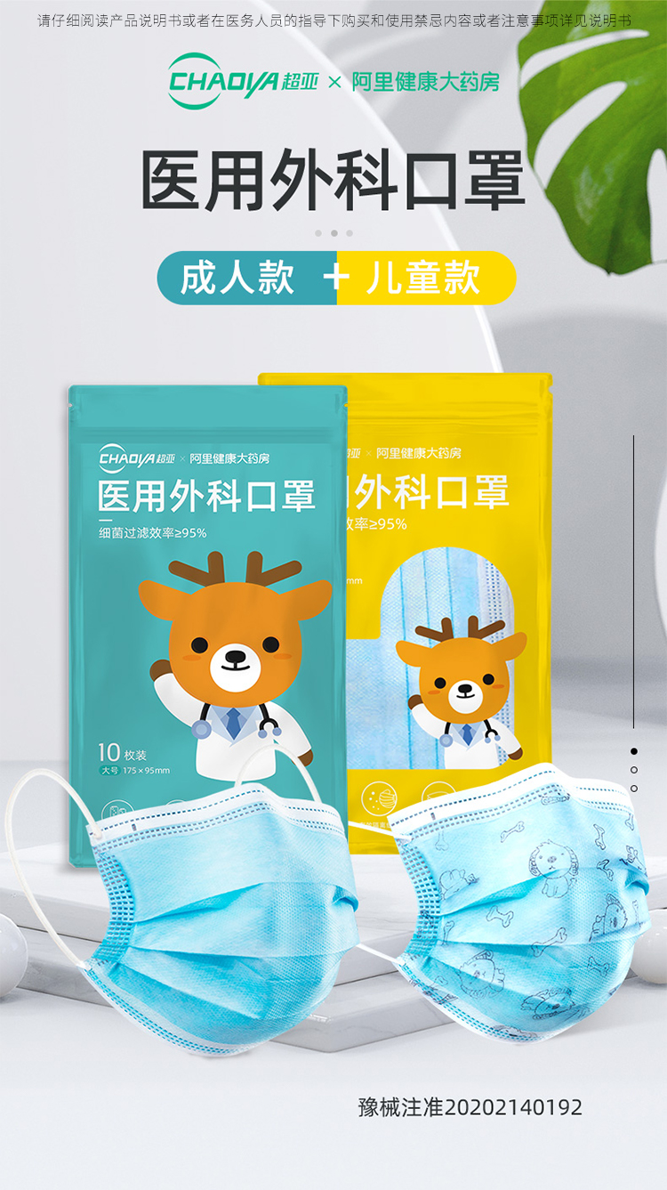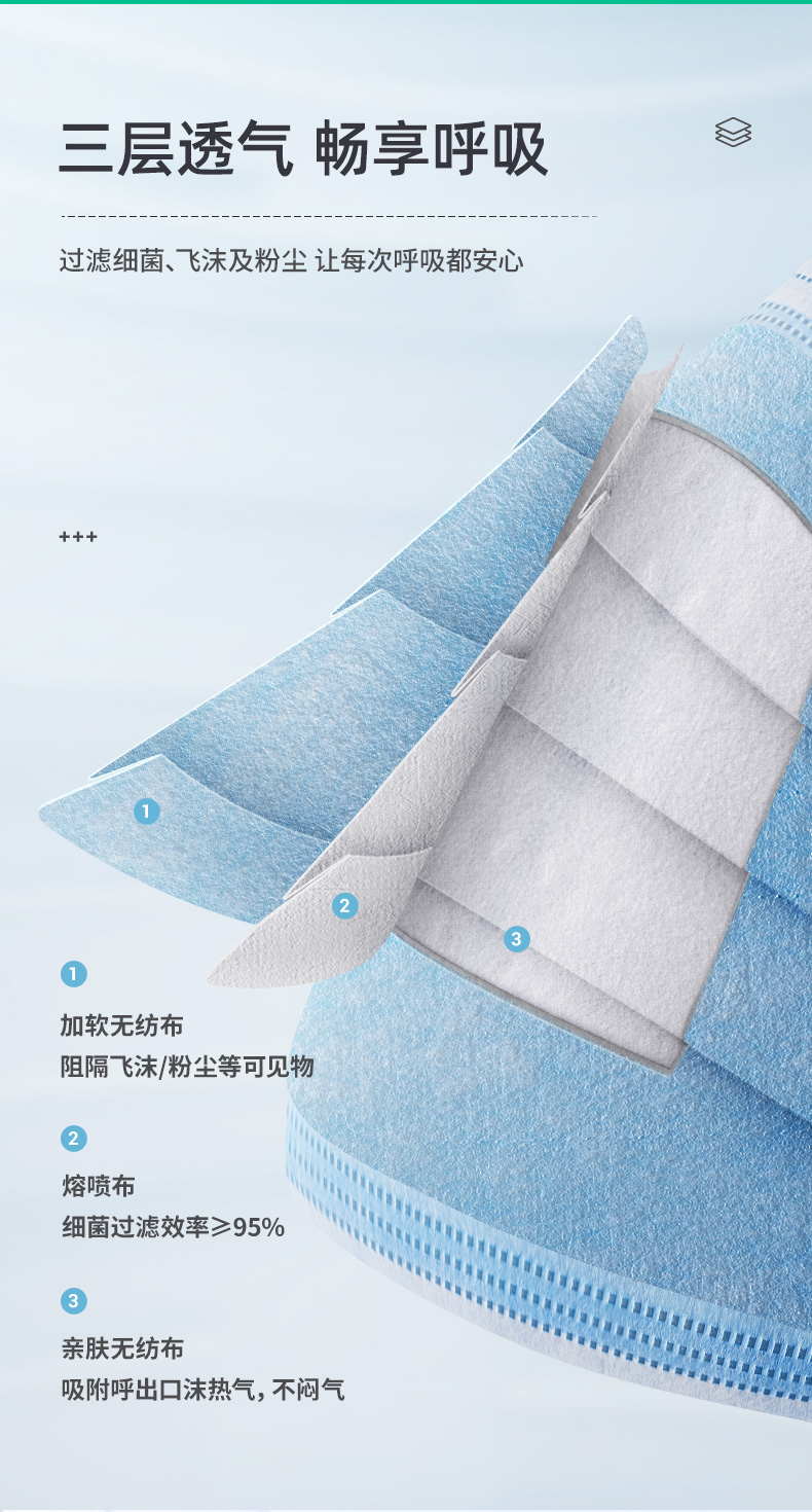 超亚一次性医用口罩,采用吸湿透气无纺布、熔喷布过滤层和拒水pd无纺布3层结构,4D立体结构更贴合脸型,细菌过滤效率达98.7%,出厂前还使用环氧乙烷灭菌,是一款防护非常严谨的一次性口罩。