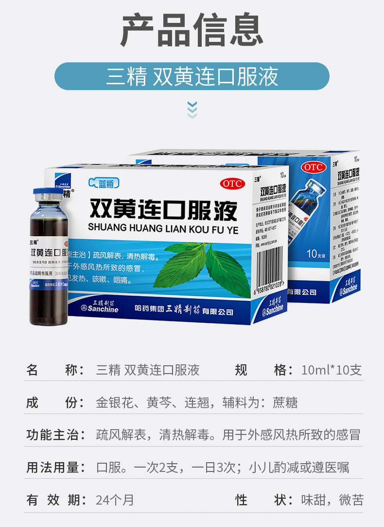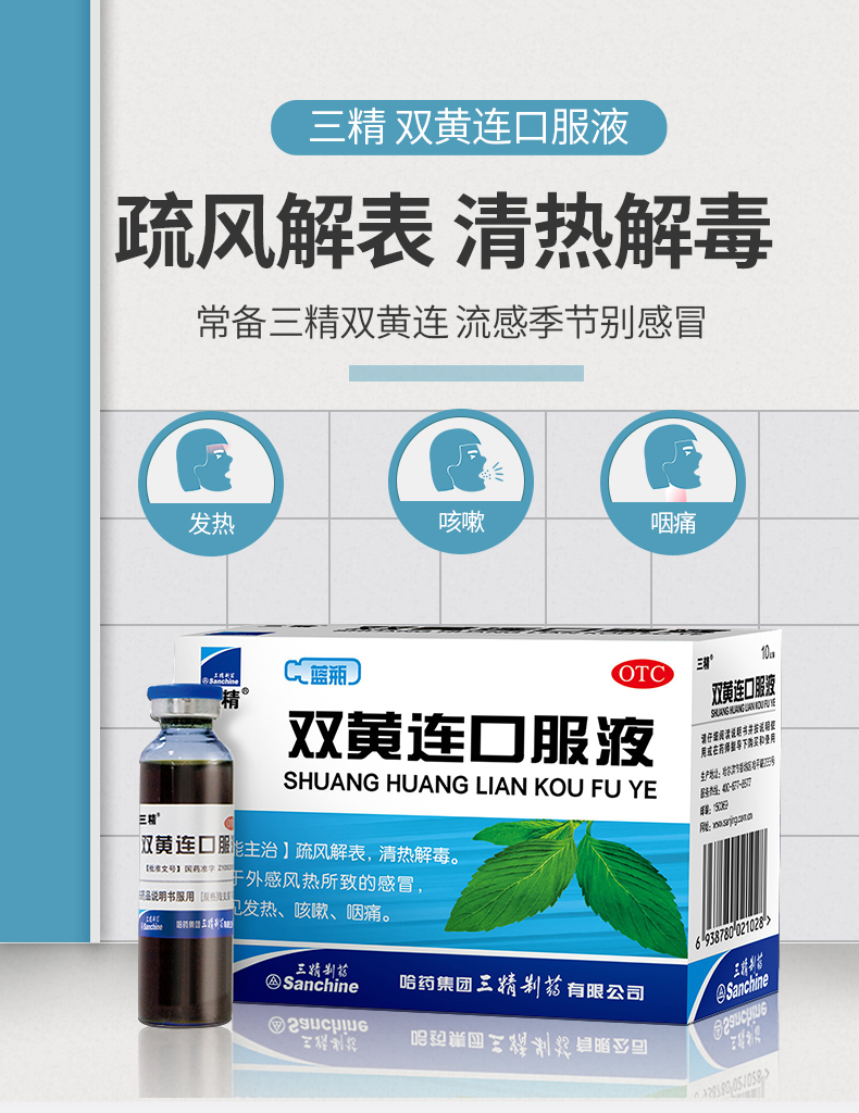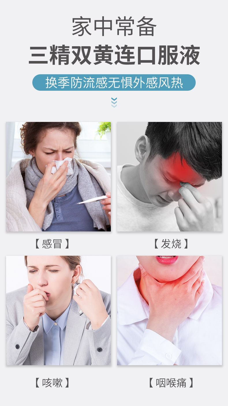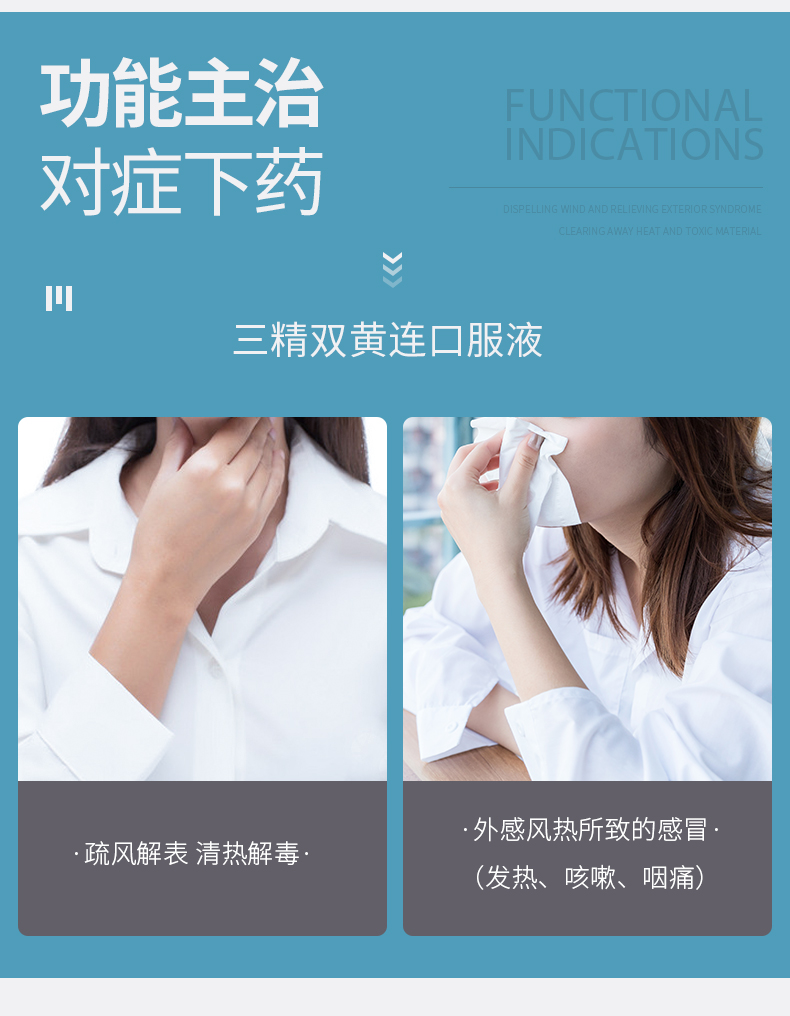 这款三精 双黄连口服液,专为风热易感冒人群定制,复合中药配方,功效是疏风解表、清热解毒,它可以解热、抗炎、抗菌、抗病毒。适用于病毒和细菌感染引起的肺炎、气管炎、支气管炎、咽炎、扁桃体炎等上呼吸道感染,及感冒、流行性感冒、病毒性感冒引起的发热、咽疼、咳嗽和老年性哮喘等。