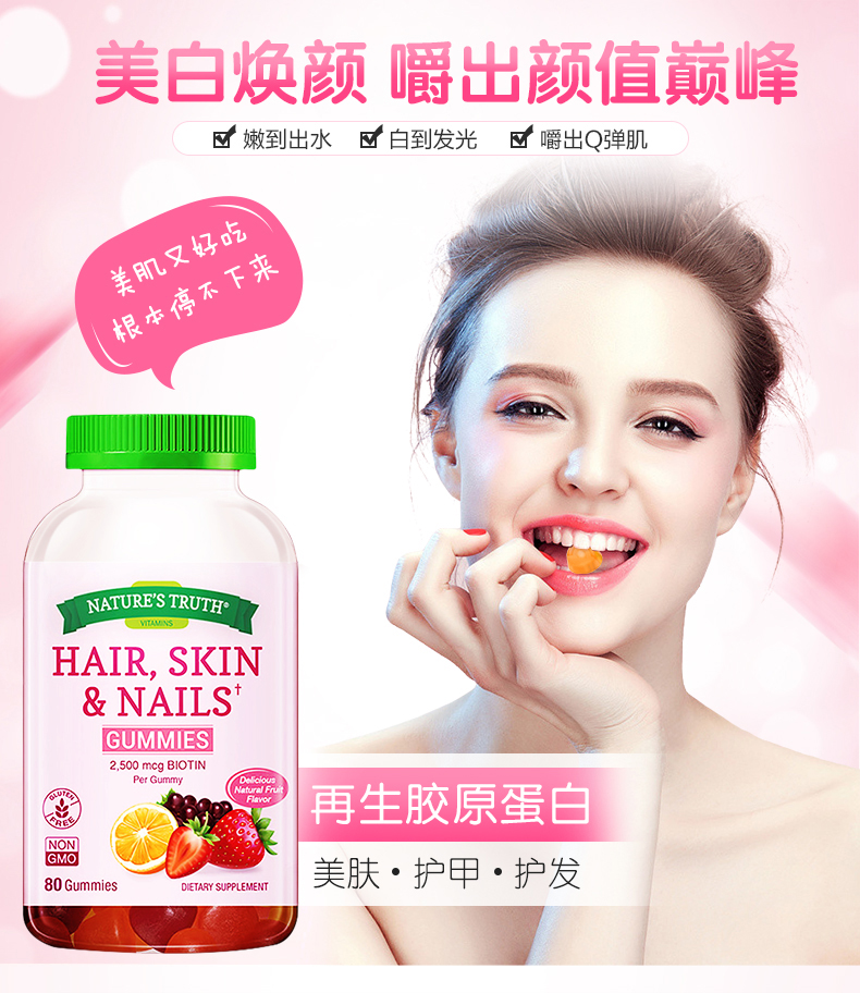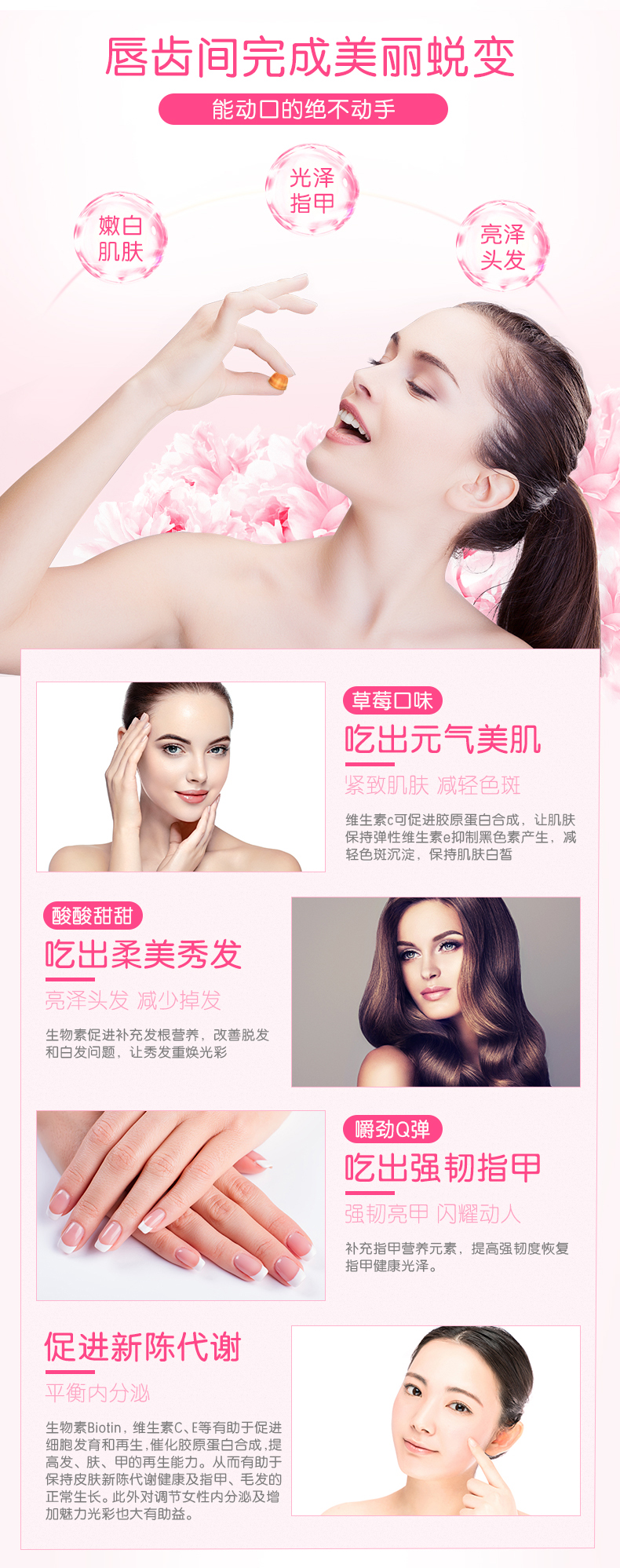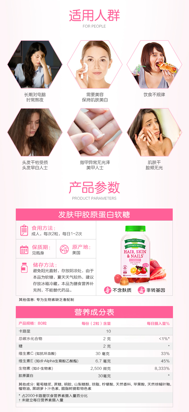 这款女士 草莓口味 胶原蛋白软糖,每粒含维生素C15mg、维生素E151U、生物素15mg,有助维持人体自然生长、发育和正常人体机能健康必要的营养素。可预防秃发、头发灰白、指甲开裂,抗氧化,清除自由基,强抵抗力,提高机体活力。