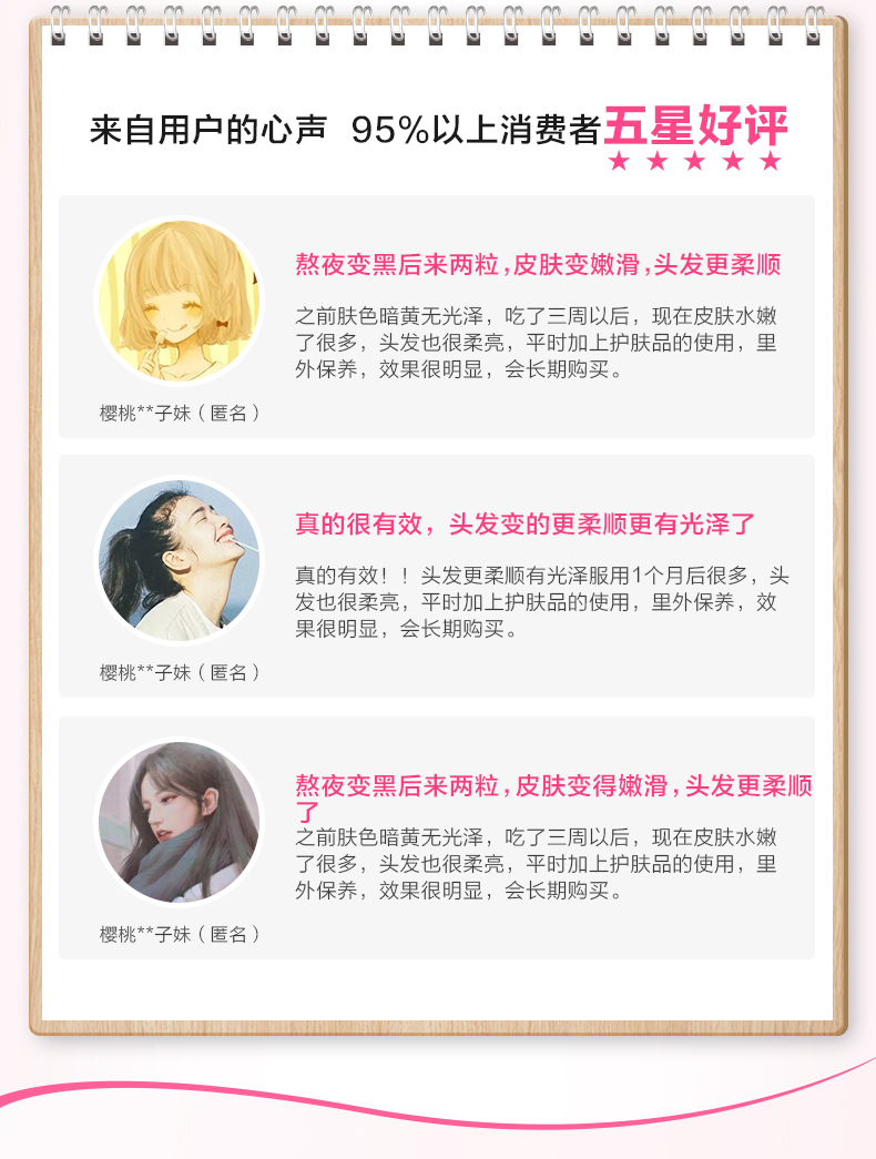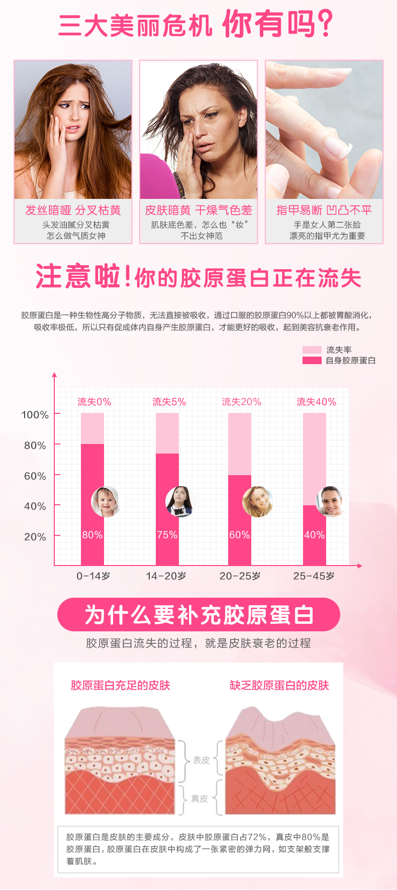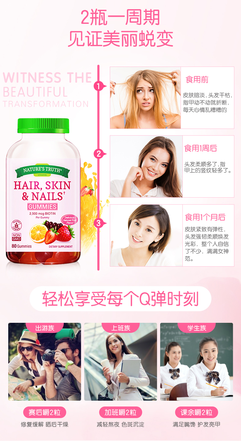 这款女士 草莓口味 胶原蛋白软糖,每粒含维生素C15mg、维生素E151U、生物素15mg,有助维持人体自然生长、发育和正常人体机能健康必要的营养素。可预防秃发、头发灰白、指甲开裂,抗氧化,清除自由基,强抵抗力,提高机体活力。