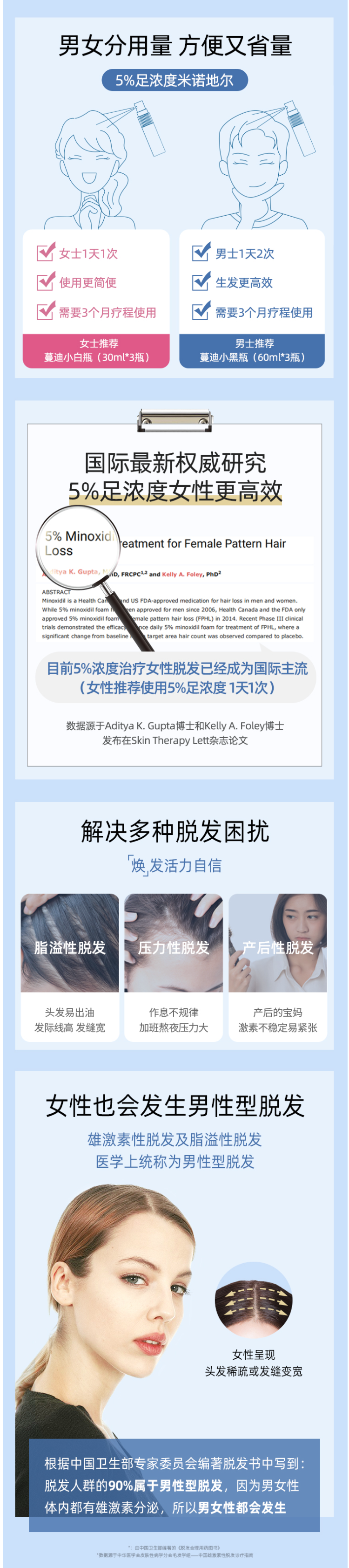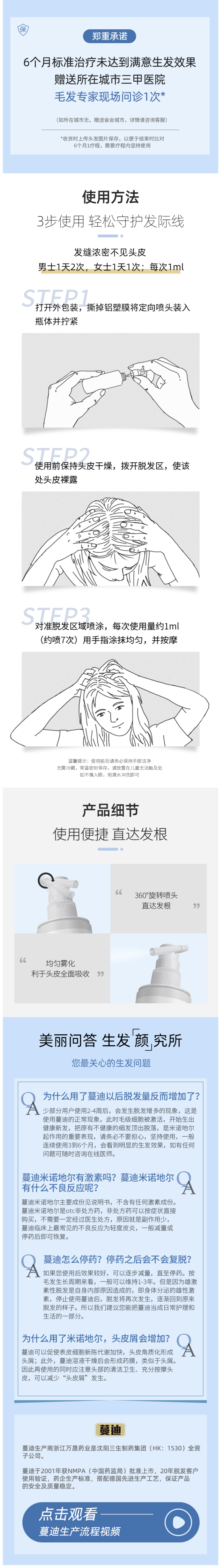 这款是国药准字OTC非处方药,是市面上真实有效的生发药用品,成份为米诺地尔,是一种周围血管舒张药,局部长期使用时,可刺激男性型脱发和斑秃患者的毛发生长。适用于男性雄激素源性脱发、女性雄激素源性脱发、斑秃患者。