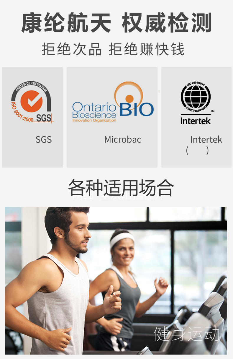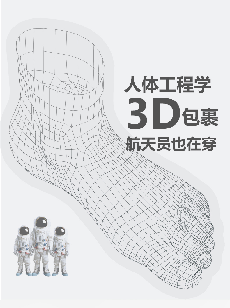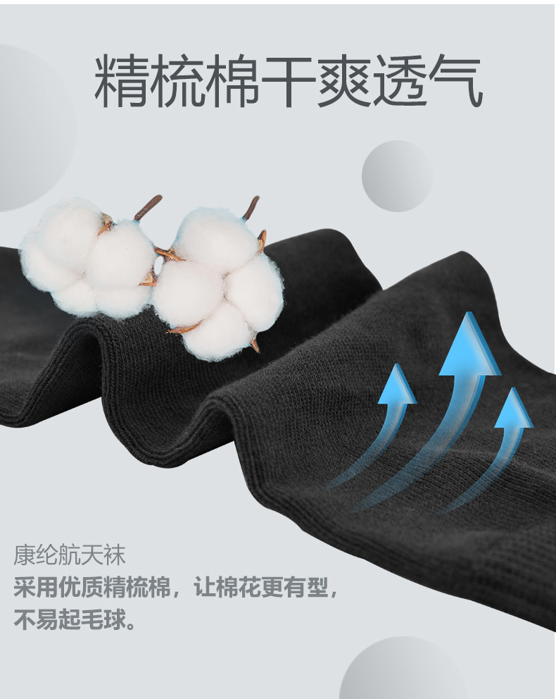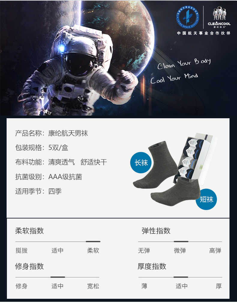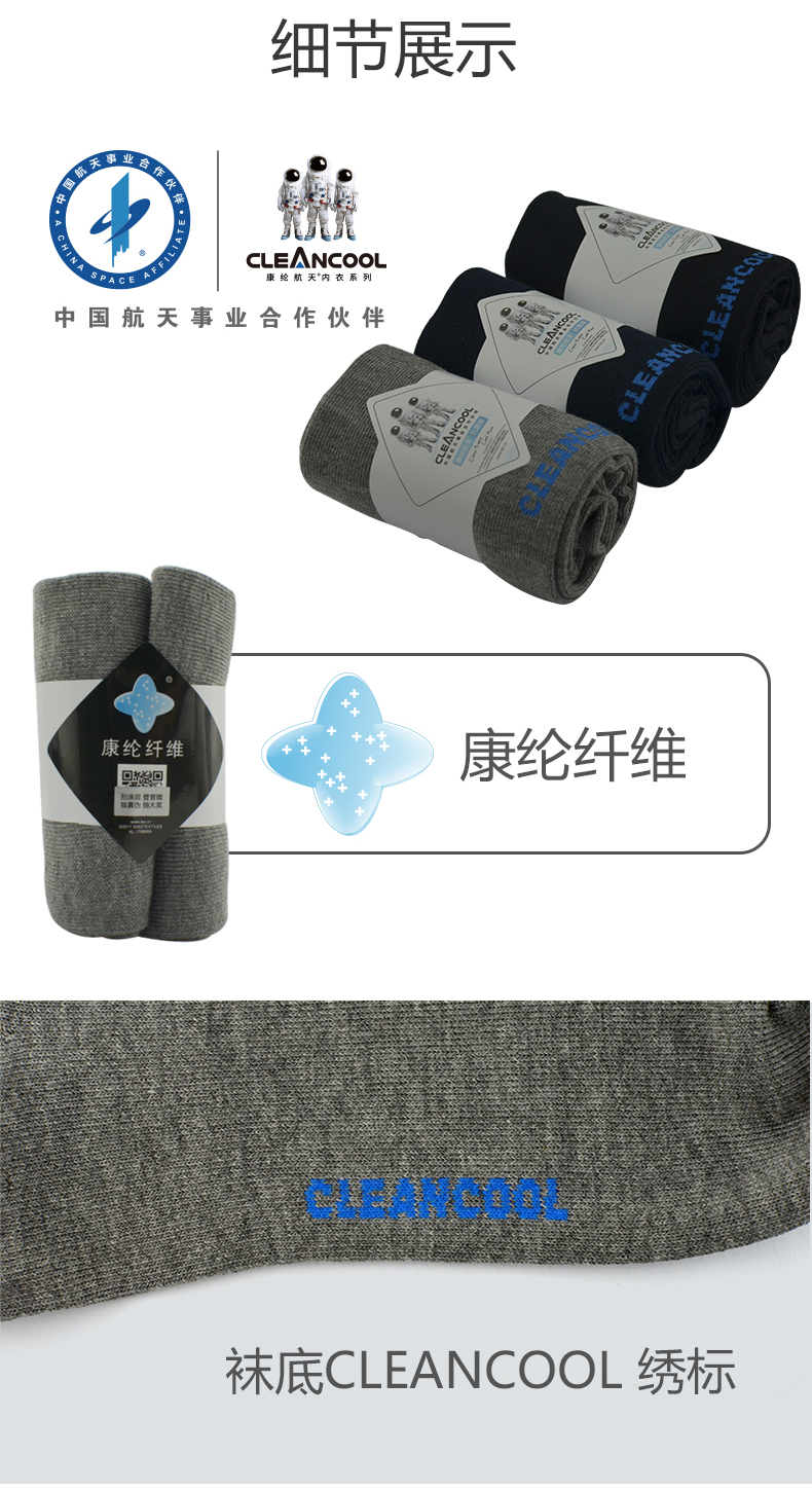 康纶航天袜子,使用棉+康纶纤维的复合面料,抗菌防臭,袜子使用人体工学设计,3D包裹脚掌,无缝缝线不勒脚,航天员也在穿,康纶纤维十字凹槽喷丝技术,具有特色的吸湿快干效果,独特的银基抗菌,使袜子具有抗菌防臭的效果。