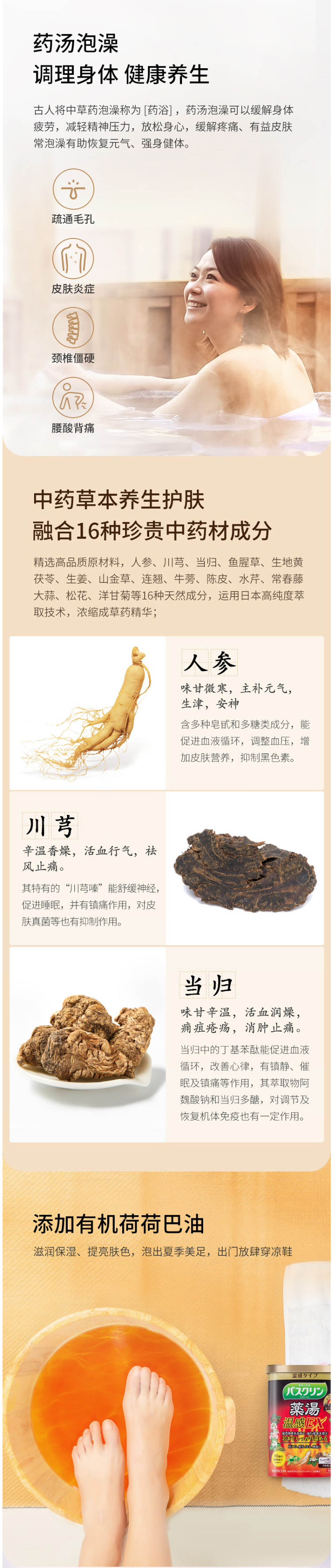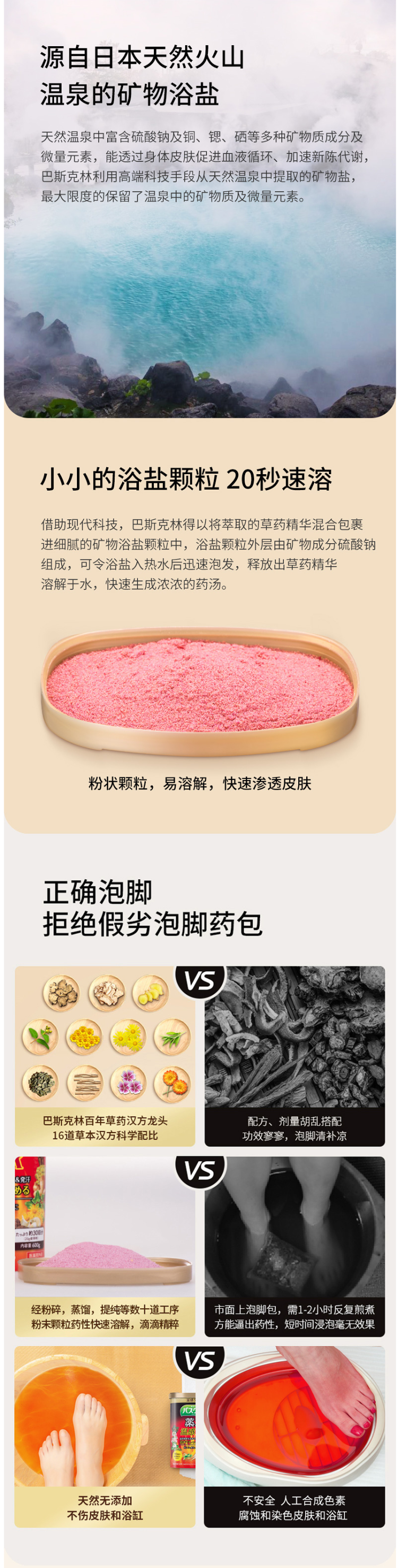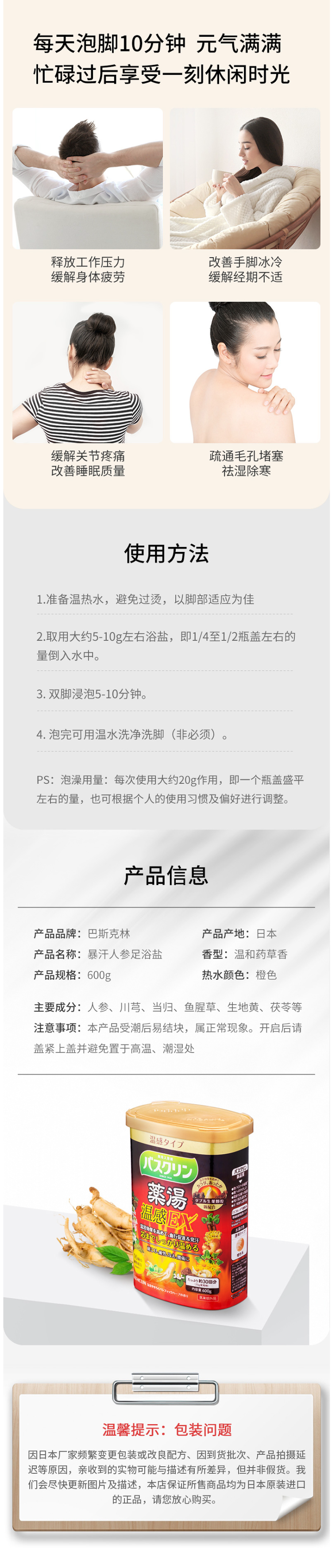 这款巴斯克林 生姜泡脚粉,日本进口,将16种天然中草药活性成分,与日本独有的天然温泉矿物盐混合,并加入有机认证荷荷巴油,既保证药用疗效又能保护皮肤不受草药刺激影响,两全其美。不添加人工色素、防腐剂、添加剂,对皮肤无刺激。