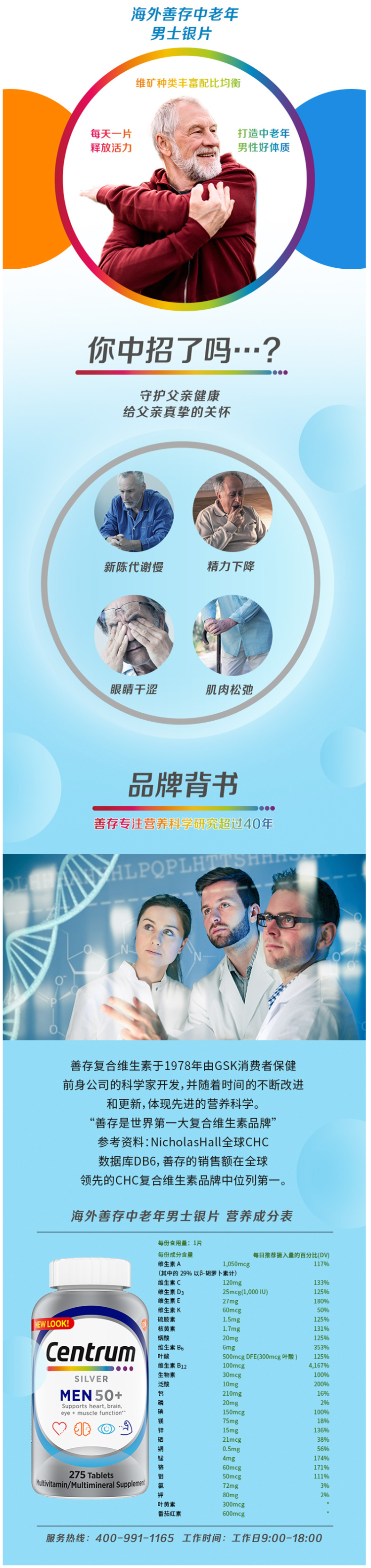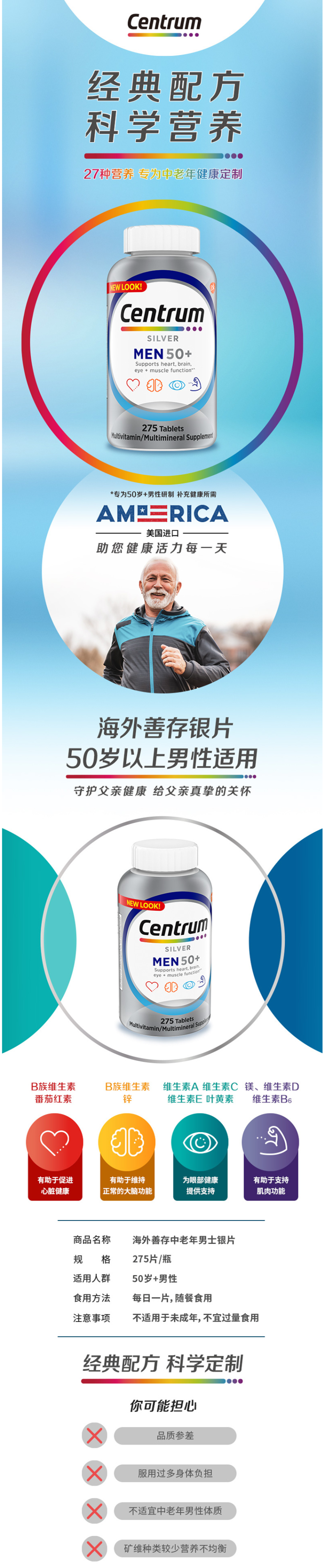 这款善存银片专为50岁以上的中老年男士设计,复合27种营养,5大维生素、8种B族、12种矿物质维生素,特别添加了番茄红素和叶黄素配比,可补充日常所需营养,提高免疫力,每日1片,随餐服用。
