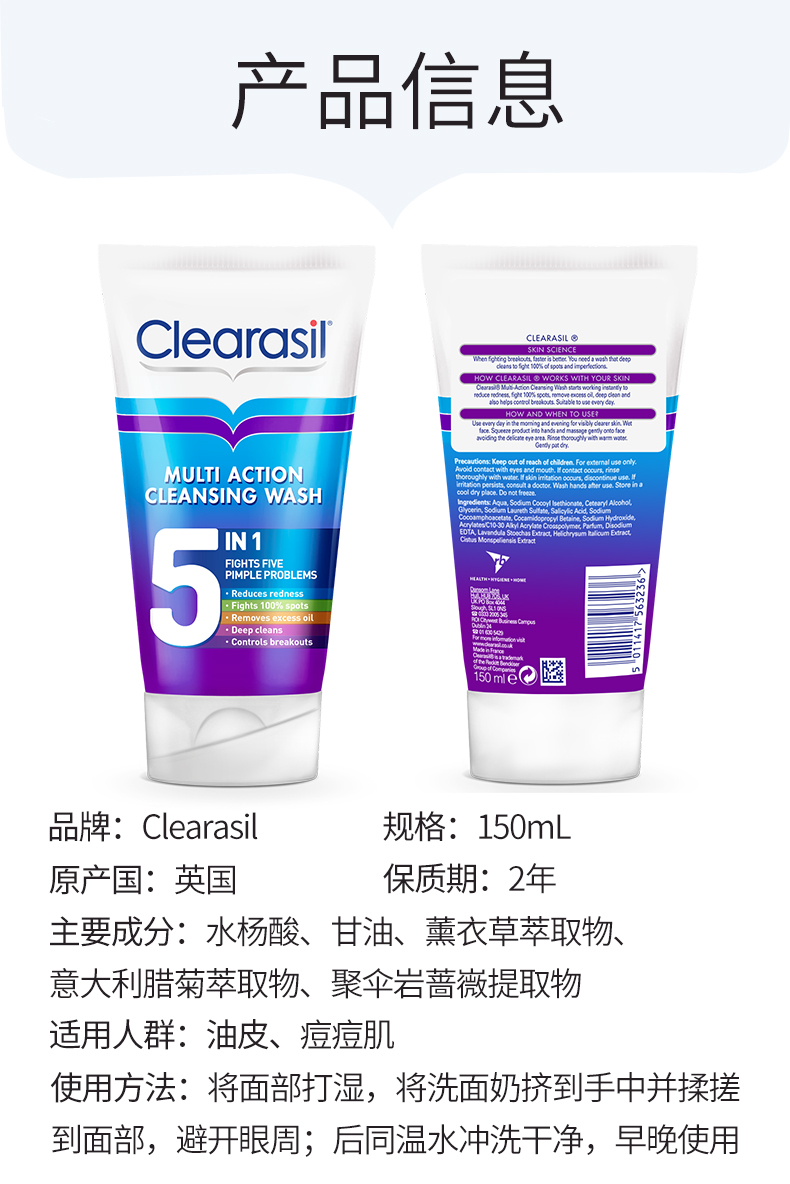 Clearasil 5效合一祛痘保湿洁面乳,美国产,主要成分是水杨酸、聚伞岩蔷薇提取物、法国薰衣草提取物、意大利蜡菊属植物提取物和柠檬精油,可以平衡脸部的水份和油脂,减轻皮肤红肿的情况、抵抗皮肤炎症和祛除痘痘,适合皮肤外油内干、刺痛红肿、多黑头闭口、毛孔堵塞、反复长痘的人群使用,